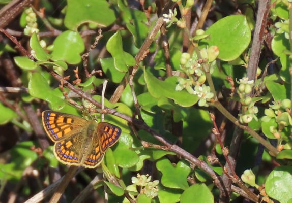 Pohuehue Muehlenbeckia australis thrives on this sloping hillside and is the host plant on which common coppers lay their eggs. It shelters the pupae underneath the plant until they are ready to eclose. Other natives providing nectar and a sunny place to rest were kaihua or NZ jasmine Parsonsia heterophylla; beach spinach Tetragonia trigyna; shore bindweed Calystegia soldanella and taupata Coprosma repens.